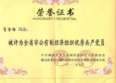 2012年7月3日,在湖南省非公有制企業(yè)黨的建設(shè)工作暨創(chuàng)先爭優(yōu)活動表彰會上,董事會秘書、工會主席、董事會辦公室主任肖雪梅同志榮獲“湖南省非工有制經(jīng)濟組織優(yōu)秀共產(chǎn)黨員”的關(guān)榮稱號。